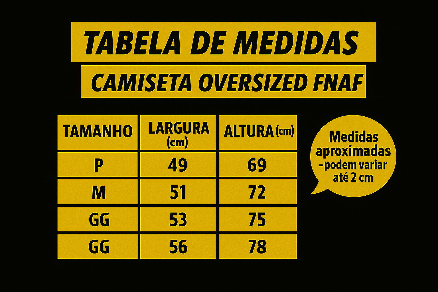 Produzida em malha premium 100% algodão, ela une conforto extremo, caimento perfeito e durabilidade de verdade. É o tipo de peça que não fica só bonita: vira assinatura de estilo pra quem vive o universo FNAF.