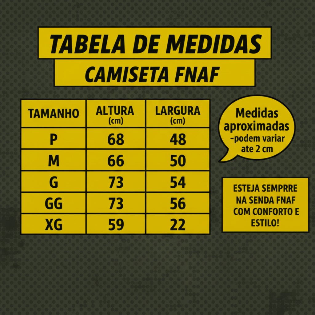 As camisetas são feitas em 100% algodão premium, com estampas em alta definição que destacam os animatrônicos mais icônicos da franquia.