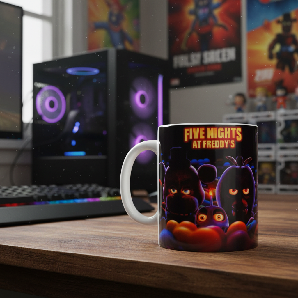 Esta caneca exclusiva destaca os animatrônicos mais icônicos da franquia, com cores vibrantes e acabamento premium — perfeita para fãs que vivem o universo de FNAF intensamente.